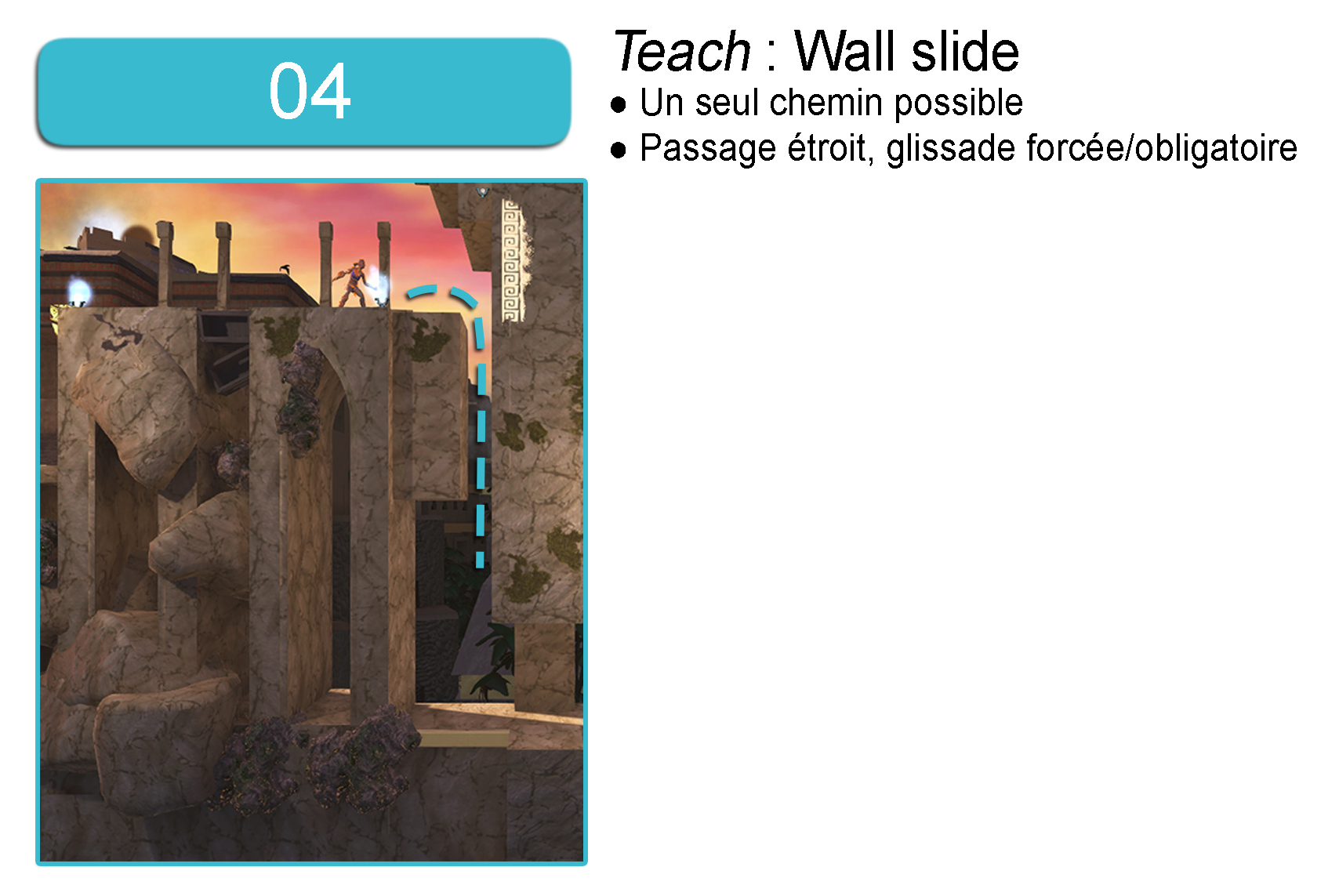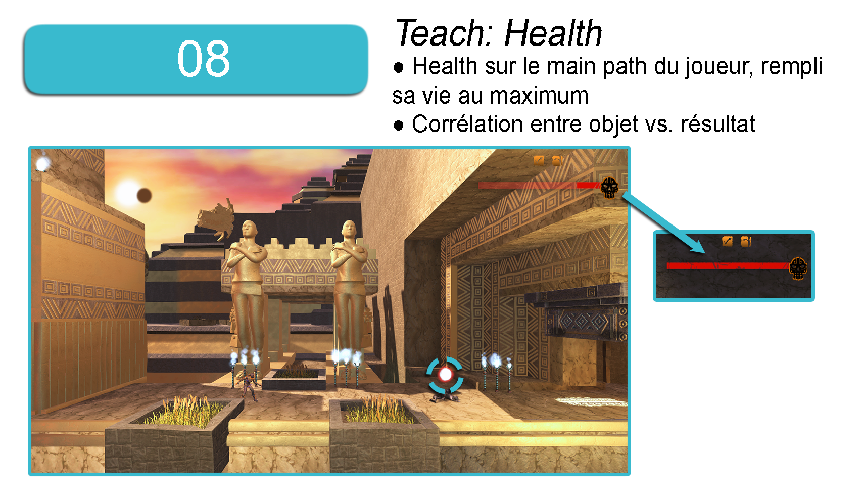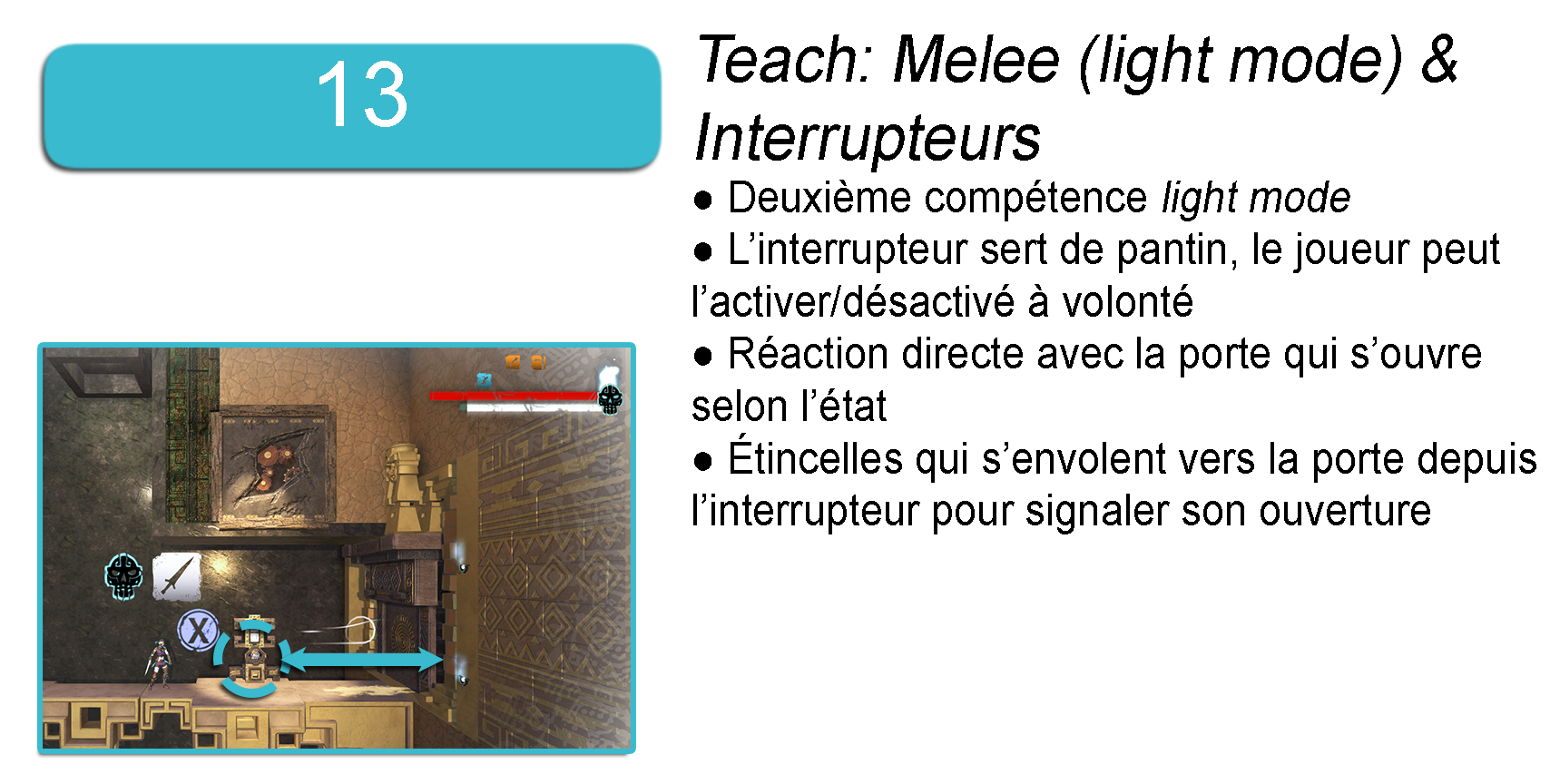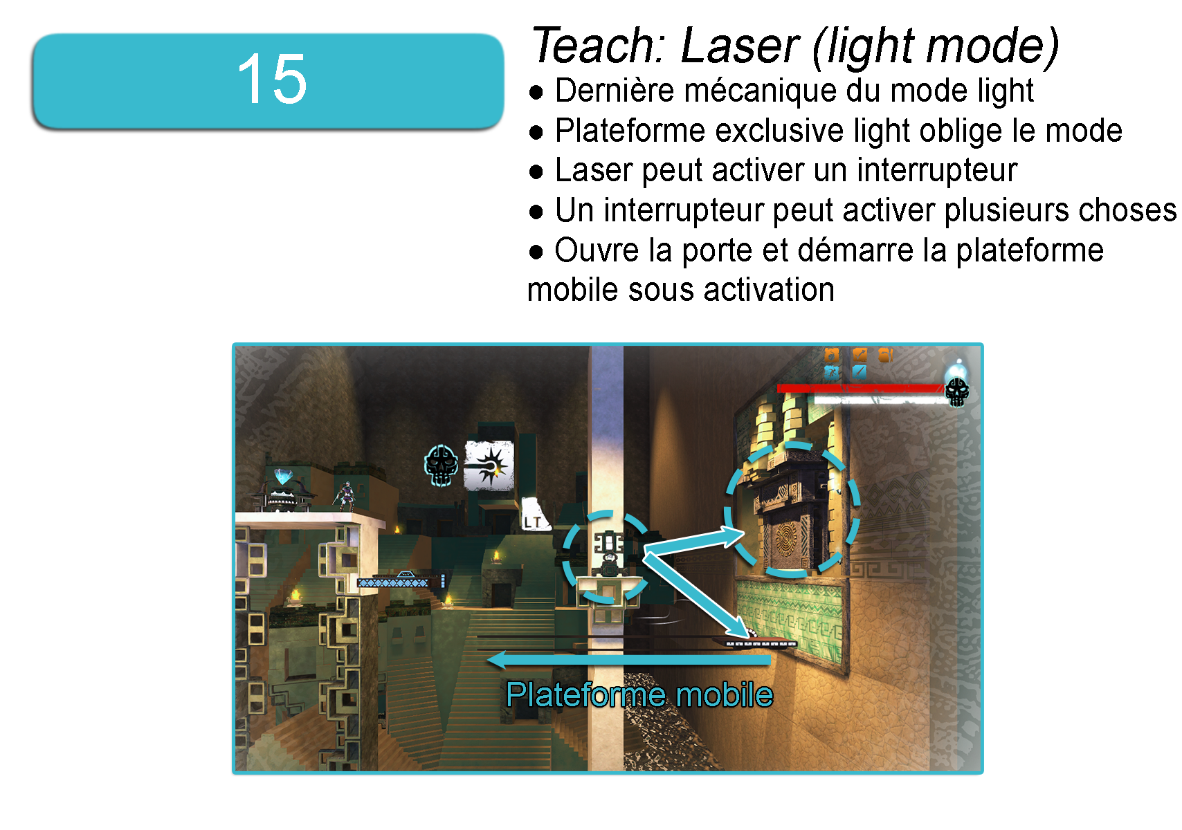 Conception du niveau tutoriel, enseignement des différentes mécaniques par le design du niveau.